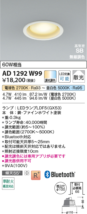 AD1292B99 コイズミ照明 高気密SBダウンライト 60W相当 埋込穴径-φ100 埋込高-66mm