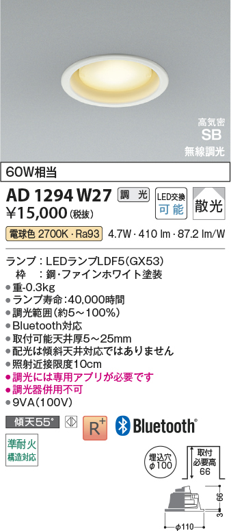 AD1294W27 コイズミ照明 高気密SBダウンライト 60W相当 埋込穴径-φ100 埋込高-66mm