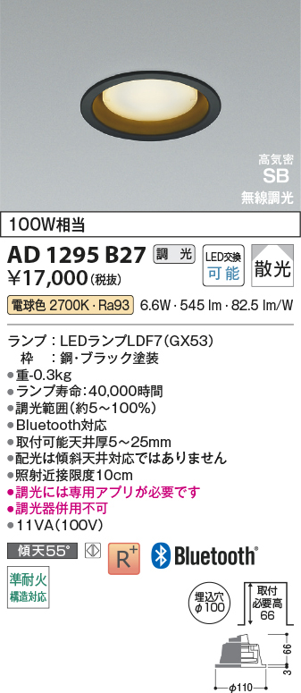 AD1295B27 コイズミ照明 高気密SBダウンライト 100W相当 埋込穴径-φ100 埋込高-66mm