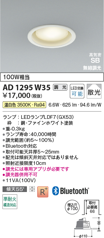 AD1295W35 コイズミ照明 高気密SBダウンライト 100W相当 埋込穴径-φ100 埋込高-66mm