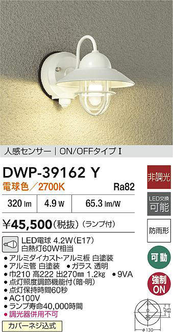 DWP-39162Y 大光電機 人感センサー付アウトドアライト (ランプ付)