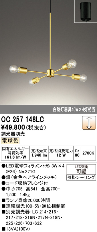 OC257148LC オーデリック LEDシャンデリア ランプ別梱包 調光器別売 (代引き不可)
