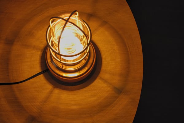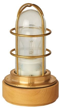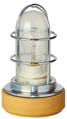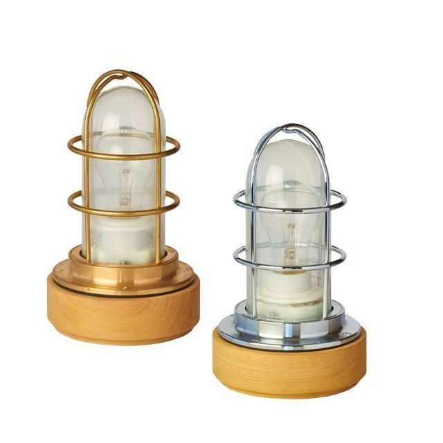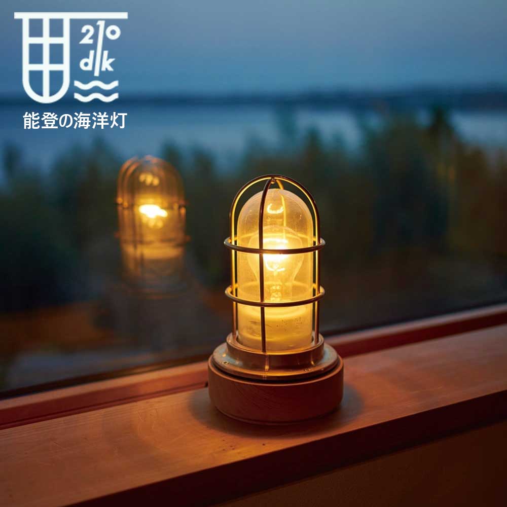 本物の船舶用作業灯をベースにした重厚なつくりとなっています。台座には能登産の木目の美しいケヤキの間伐材を使用、能登のノスタルジックなイメージも。ガードの影と、放射状に広がる白熱電球の光が、室内にちょっとしたキャビン気分をもたらしてくれます。コンセントプラグ式なので、気軽にお部屋のインテリアとしてお使いいただけます。