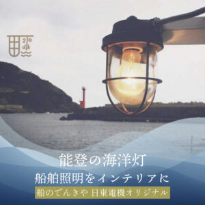 日東電機は創業1951年、能登半島輪島で魚群探知機や無線の修理、電気装備工事を行い漁師さんたちに頼りにされてきました。「能登の海洋灯」シリーズは、海が本当に好きだ、海を見ている時間が一番楽しいと語る同社の代表取締役 沖崎氏がオリジナルで企画開発したシリーズ。昭和40年頃から漁船で作業灯や通路灯として本当に使われている船舶照明器具をアレンジし、家庭やお店で使えるようにしました。
