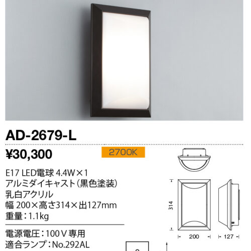 | 説明文 | 耐水性能:防雨 取付方法:工事 光色(LED):電球色 色温度(K):2700K 演色性(Ra):Ra83 LEDタイプ:LED電球 従来光源相当:白熱40W相当 調光:非調光 光源仕様:E17 LED電球 4.2W×1 適合ランプ:東芝製LDA4L-G-E17/S/40W 寸法:幅200mm・高314mm・出127mm 重量:1.1kg 材質仕上:本体:アルミダイキャスト(黒色塗装)/セード:乳白アクリル 電圧:100V専用 定格光束(LED):221lm 消費電力(LED):4.2W 固有エネルギー消費効率(LED):52.7lm/W LEDモジュール寿命:40000 電源電圧100V専用 2700K Ra83 白熱40W相当 防雨型 ブラケットタイプ ※LED素子にはバラツキがあるため同一形名の器具においても光色、明るさが異なる場合があります。 |