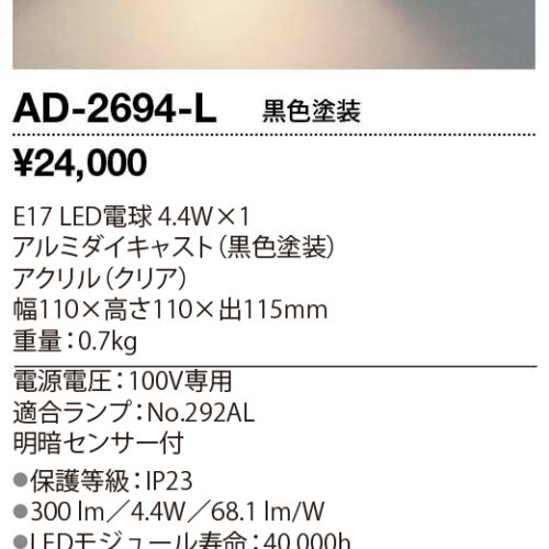 | 説明文 | 耐水性能:防雨 取付方法:工事 光色(LED):電球色 色温度(K):2700K 演色性(Ra):Ra83 LEDタイプ:LED電球 従来光源相当:白熱40W相当 調光:非調光 センサー:照度センサ 光源仕様:E17 LED電球 4.1W×1 適合ランプ:LDA4L-H-E17/S/40W(東芝) 寸法:幅110mm・高110mm・出115mm 重量:0.7kg 材質仕上:アルミダイキャスト(黒色塗装)/アクリル(クリア) 電圧:100V専用 定格光束(LED):254lm 消費電力(LED):4.1W 固有エネルギー消費効率(LED):62lm/W LEDモジュール寿命:40000 電源電圧100V専用 2700K Ra83 明暗センサー:暗くなると自動的に点灯します。 ブラケットタイプ 防雨型 ※LED素子にはバラツキがあるため同一形名の器具においても光色、明るさが異なる場合があります。 |