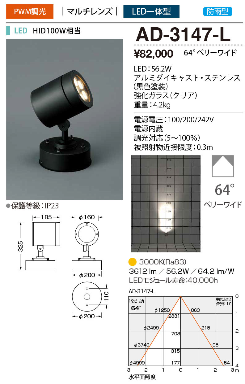 | 説明文 | 耐水性能:防雨 取付方法:工事 配光角度:64° 光色(LED):電球色 色温度(K):3000K 演色性(Ra):Ra83 LEDタイプ:LED一体型 従来光源相当:HID100W相当 調光:PWM調光 光源仕様:LED 56.2W 寸法:幅φ160mm・長185mm・高325mm 重量:4.2kg 材質仕上:本体:アルミダイキャスト・ステンレス(黒色塗装)/カバー:強化ガラス(クリア) 電圧:100V/200V/242V 定格光束(LED):3612lm 消費電力(LED):56.2W 固有エネルギー消費効率(LED):64.2lm/W LEDモジュール寿命:40000 電源電圧100V/200V/242V 電源内蔵 調光対応(5〜100%) 3000K Ra83 ベリーワイド64° HID100W相当 被照射物近接限度:0.3m |