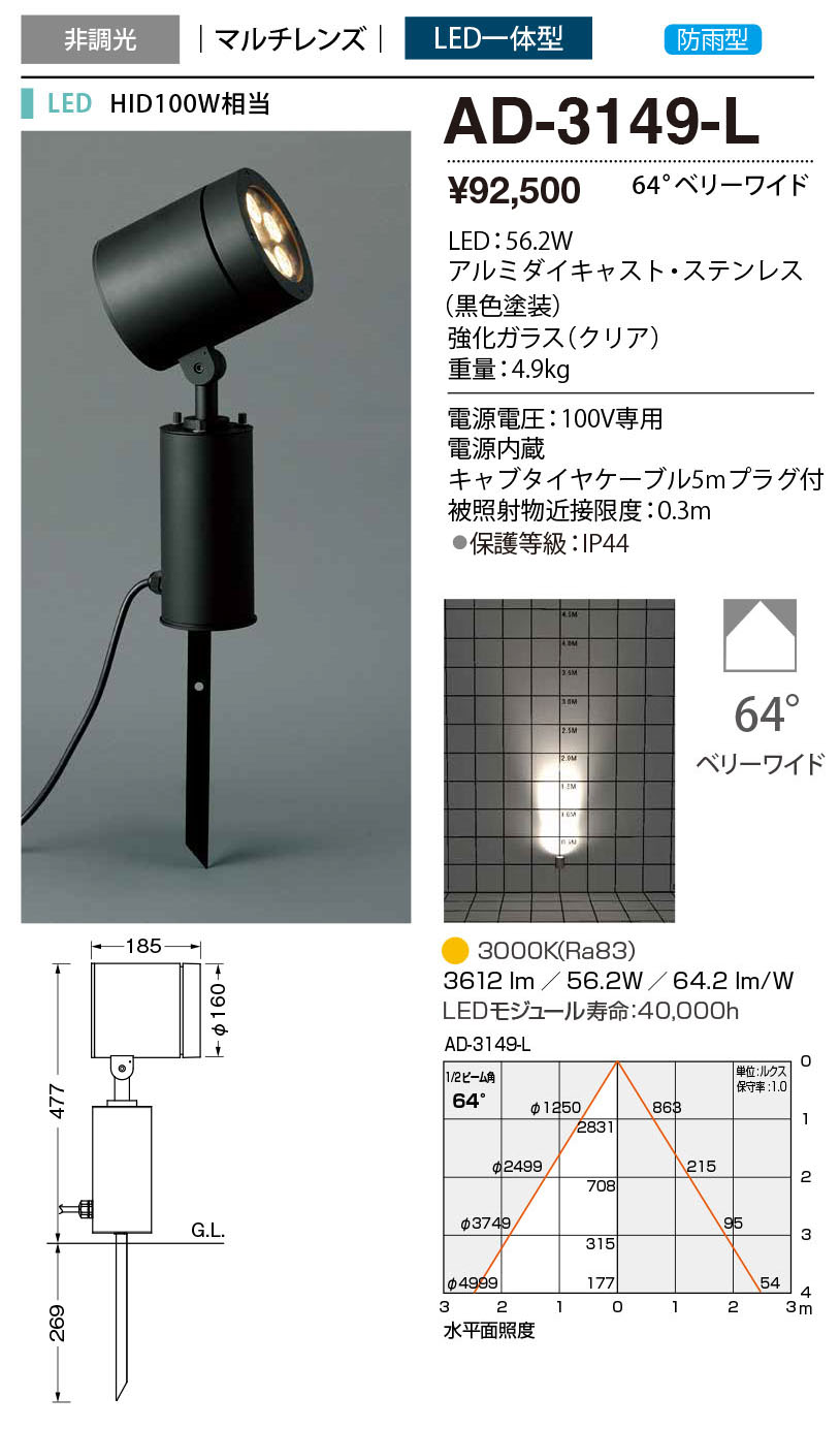 | 説明文 | 耐水性能:防雨 取付方法:その他 配光角度:64° 光色(LED):電球色 色温度(K):3000K 演色性(Ra):Ra83 LEDタイプ:LED一体型 従来光源相当:HID100W相当 調光:非調光 光源仕様:LED 56.2W 寸法:幅φ160mm・長185mm・高477mm・埋込深269mm 重量:4.9kg 材質仕上:本体:アルミダイキャスト・ステンレス(黒色塗装)/カバー:強化ガラス(クリア) 電圧:100V専用 定格光束(LED):3612lm 消費電力(LED):56.2W 固有エネルギー消費効率(LED):64.2lm/W LEDモジュール寿命:40000 電源電圧100V専用 電源内蔵 3000K Ra83 ベリーワイド64° HID100W相当 被照射物近接限度:0.3m スパイク式 |