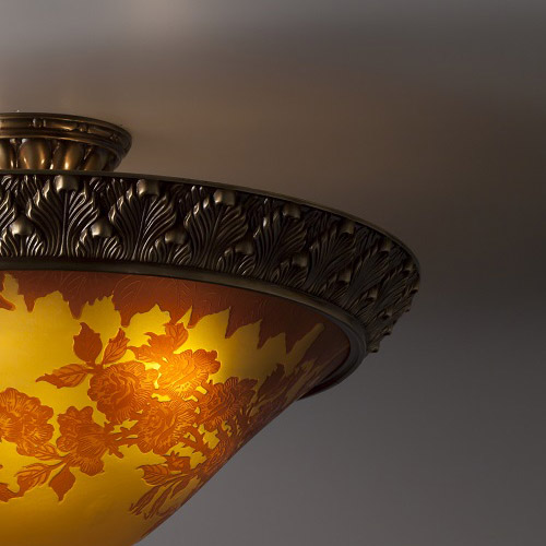 | 説明文 | 本体:総真鍮製メタルフレーム(アンティークブロンズ仕様) グローブ:ルーマニア製カメオ彫りガレ風ガラス(文様:レッドローズ) 幅φ560 高365mm 10.2Kg |