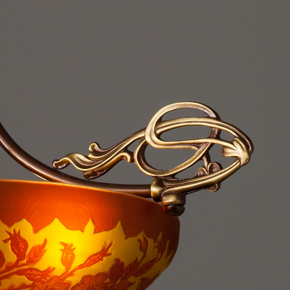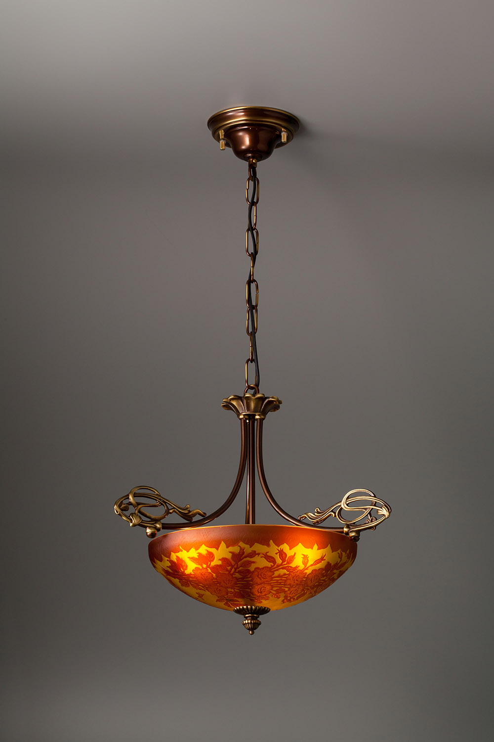 | 説明文 | 本体:総真鍮製メタルフレーム(アンティークブロンズ仕様) グローブ:ルーマニア製カメオ彫りガレ風ガラス(文様:レッドローズ) 幅φ480 高385 全長520-700mm 3.3Kg |