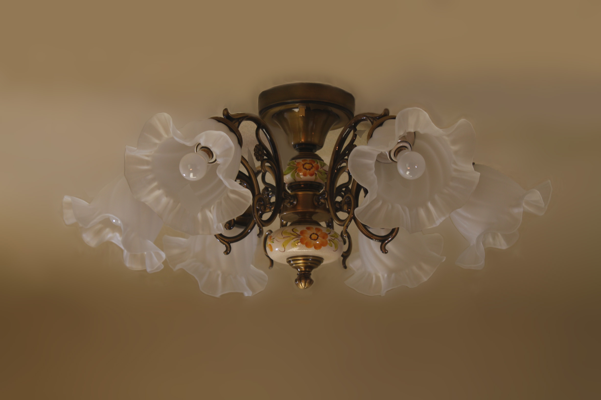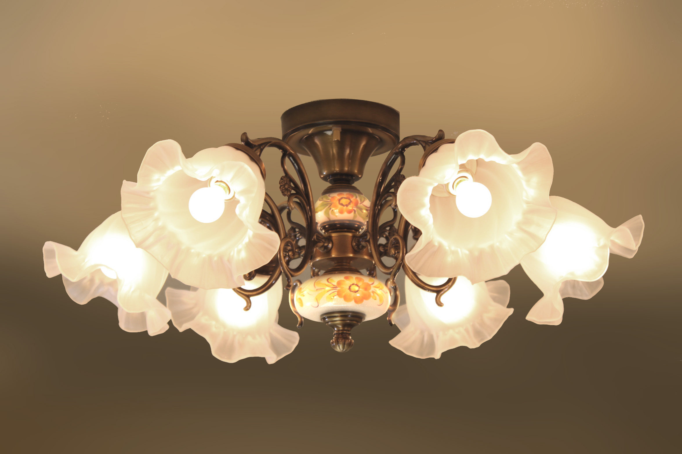 AKL201-H6-252-LED 輸入照明 スペイン製 古美色メッキ ハンドペイント陶器真鍮6灯シーリングシャンデリア