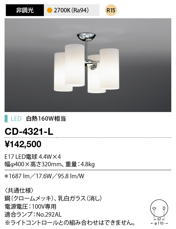 | 説明文 | 取付方法:工事 光色(LED):電球色 色温度(K):2700K 演色性(Ra):Ra83 LEDタイプ:LED電球 従来光源相当:白熱160W相当 調光:非調光 光源仕様:E17 LED電球 4.2W×4 適合ランプ:東芝製LDA4L-G-E17/S/40W 寸法:幅φ400mm・高320mm 重量:4.8kg 材質仕上:鋼(クロームメッキ)/乳白ガラス(消し) 電圧:100V専用 定格光束(LED):1432lm 消費電力(LED):16.8W 固有エネルギー消費効率(LED):85.2lm/W LEDモジュール寿命:40000 電源電圧100V専用 非調光 電球形蛍光灯(A15形)使用可能 クリプトン球(ホワイト)PS60W形まで使用可能 2700K Ra83 ※ライトコントロールとの組み合わせはできません。 ※LED素子にはバラツキがあるため同一形名の器具においても光色、明るさが異なる場合があります。 |