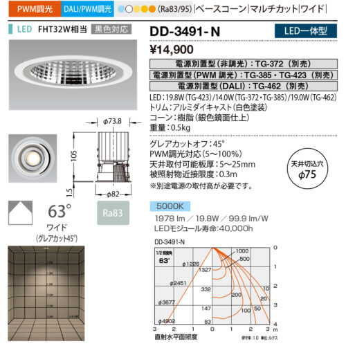 | 説明文 | 切込穴寸法:φ75mm 取付必要高:130mm/150mmmm 配光角度:65° 光色(LED):昼白色 色温度(K):5000K 演色性(Ra):Ra83 LEDタイプ:LED一体型 従来光源相当:FHT32W相当 調光:PWM調光 光源仕様:LED 20.7W 寸法:幅φ82mm・出1.5mm・埋込深108mm 重量:0.5kg 材質仕上:トリム:アルミダイキャスト(白色塗装)/コーン:樹脂(銀色鏡面仕上) 電圧:100V〜242V 電源:別置 定格光束(LED):1922lm 消費電力(LED):20.7W 固有エネルギー消費効率(LED):92.8lm/W LEDモジュール寿命:40000 電源電圧100V〜242V 電源別置型 グレアカットオフ:45° PWM調光対応(5〜100%:TG-423接続時) 取付可能天井厚5〜25mm 被照射物近接限度0.3m マルチカット |