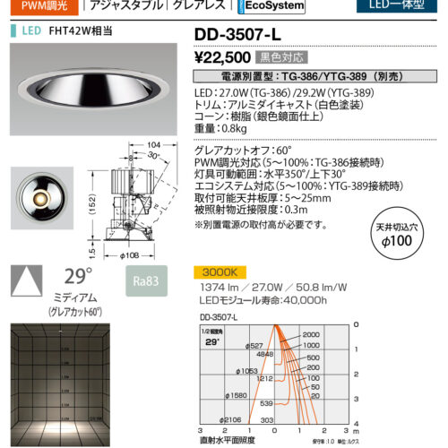 | 説明文 | 切込穴寸法:φ100mm 取付必要高:125mmmm 配光角度:27° 光色(LED):電球色 色温度(K):3000K 演色性(Ra):Ra83 LEDタイプ:LED一体型 従来光源相当:FHT42W相当 調光:PWM調光 光源仕様:LED 28W 寸法:幅φ108mm・出1.5mm・埋込深155mm 重量:0.8kg 材質仕上:トリム:アルミ(白色塗装)/コーン:アルミ(銀色鏡面仕上) 電圧:100V〜242V 電源:別置 定格光束(LED):1155lm 消費電力(LED):28W 固有エネルギー消費効率(LED):41.2lm/W LEDモジュール寿命:40000 電源電圧100V〜242V 電源別置型 グレアカットオフ:60° PWM調光対応(5〜100%:TG-386接続時) エコシステム対応(5〜100%:YTG-389接続時) 取付可能天井厚5〜25mm 被照射物近接限度0.3m |