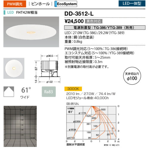 | 説明文 | 切込穴寸法:φ100mm 取付必要高:125mmmm 配光角度:60° 光色(LED):電球色 色温度(K):3000K 演色性(Ra):Ra83 LEDタイプ:LED一体型 従来光源相当:FHT42W相当 光源仕様:LED 28W 寸法:幅φ122mm・出1.6mm・埋込深90mm 重量:0.8kg 材質仕上:本体:鋼(白色塗装) 電圧:100V〜242V 電源:別置 定格光束(LED):1768lm 消費電力(LED):28W 固有エネルギー消費効率(LED):63.1lm/W LEDモジュール寿命:40000 電源電圧100V〜242V 電源別置型 PWM調光対応(5〜100%:TG-386接続時) エコシステム対応(5〜100%:YTG-389接続時) 取付可能天井厚5〜25mm 被照射物近接限度0.3m ピンホール |