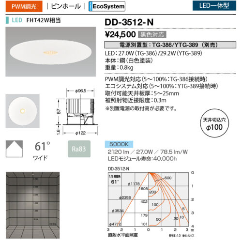 | 説明文 | 切込穴寸法:φ100mm 取付必要高:125mmmm 配光角度:60° 光色(LED):昼白色 色温度(K):5000K 演色性(Ra):Ra83 LEDタイプ:LED一体型 従来光源相当:FHT42W相当 光源仕様:LED 28W 寸法:幅φ122mm・出1.6mm・埋込深90mm 重量:0.8kg 材質仕上:本体:鋼(白色塗装) 電圧:100V〜242V 電源:別置 定格光束(LED):1835lm 消費電力(LED):28W 固有エネルギー消費効率(LED):65.5lm/W LEDモジュール寿命:40000 電源電圧100V〜242V 電源別置型 PWM調光対応(5〜100%:TG-386接続時) エコシステム対応(5〜100%:YTG-389接続時) 取付可能天井厚5〜25mm 被照射物近接限度0.3m ピンホール |