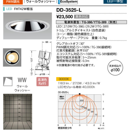 | 説明文 | 切込穴寸法:φ100mm 取付必要高:125mmmm 光色(LED):電球色 色温度(K):3000K 演色性(Ra):Ra97 LEDタイプ:LED一体型 従来光源相当:FHT42W相当 光源仕様:LED 28W 寸法:幅φ108mm・出1.5mm・埋込深140mm 重量:0.7kg 材質仕上:トリム:アルミ(白色塗装)/コーン:アルミ(銀色鏡面仕上)/ディフューザー:アクリル 電圧:100V〜242V 電源:別置 定格光束(LED):1185lm 消費電力(LED):28W 固有エネルギー消費効率(LED):42.3lm/W LEDモジュール寿命:40000 電源電圧100V〜242V 電源別置型 グレアカットオフ:30° PWM調光対応(5〜100%:TG-386接続時) エコシステム対応(5〜100%:YTG-389接続時) 取付可能天井厚5〜25mm 被照射物近接限度0.3m |