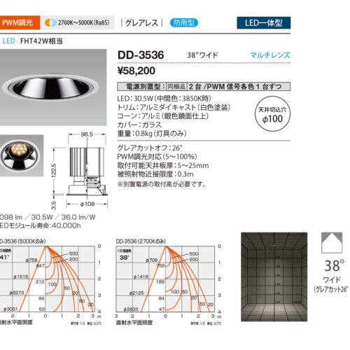 | 説明文 | 耐水性能:防雨 切込穴寸法:φ100mm 配光角度:38° 光色(LED):調色 色温度(K):2700K〜5000K 演色性(Ra):Ra85 LEDタイプ:LED一体型 従来光源相当:FHT42W相当 光源仕様:LED 30.5W 寸法:幅φ108mm・出4mm・埋込深125mm 重量:0.8kg 材質仕上:トリム:アルミ(白色塗装)/コーン:アルミ(銀色鏡面仕上)/カバー:ガラス 電圧:100V〜242V 電源:別置 定格光束(LED):1098lm 消費電力(LED):30.5W 固有エネルギー消費効率(LED):36lm/W LEDモジュール寿命:40000 電源同梱(2台:PWM信号用各色1台ずつ)※灯具1台に対し2台接続/幅40mm・高30mm・長158.5mm/重0.2kg 電源別置型 グレアカットオフ:26° PWM調光対応(5〜100%:TG-386接続時) 取付可能天井厚5〜25mm 被照射物近接限度0.3m 2700K〜5000K Ra85 |
