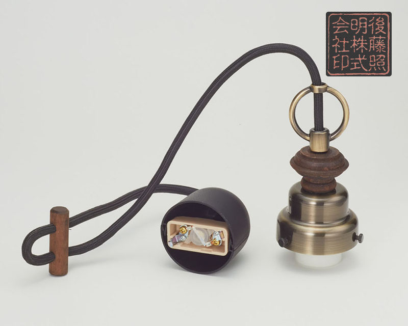 ・スチール(真鍼ブロンズ鍍金)・丸環(真鍮ブロンズ鍍金)・木製節り・小ロポルダー(真籟プロンズ鍍金)?E-26モーガルソケット・黒コード・引掛シーリングキャップ付・黒CPフレンジ・丸木自在(茶)付
