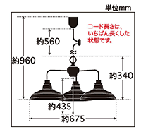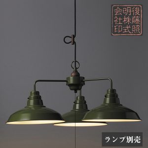 | 説明文 | コード長さ約56.0cm 全長約96.0cm 幅約67.5cm 高さ約34.0cm 重量約2,050g ・アルミ配照セード(緑塗装/内面白塗装) ・スチール(緑塗装)・丸環(緑塗装)・木製飾り・小ロホルダー(緑塗装) ?E-26モーガルソケット・黒コード・引掛シーリングキャップ付・黒CPフレンジ・丸木自在(茶)付・プルスイッチ付(ON-OFF) |