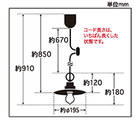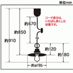 | 説明文 | コード長さ約67.0cm 全長約85.0cm 幅約19.5cm 高さ約12.0cm 重量約335g ・アルミP l セード(生地) ・スチール(真鍮ブロンズ鍍金) ・丸環(真鍮ブロンズ鍍金)・小ロホルダー(真鍮ブロンズ鍍金) ?E-26モーガルソケット・黒コード・引掛シーリングキャップ付・黒CPフレンジ・丸木自在(茶)付 |