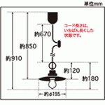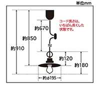 | 説明文 | コード長さ約67.0cm 全長約85.0cm 幅約19.5cm 高さ約12.0cm 重量約347g ・アルミPlセード(黒塗装/内面白塗装)・スチール(黒塗装)・丸環(黒塗装)・小ロホルダ一(黒塗装)・E-26モーガルソケット・黒コード・引掛シーリングキャップ付・黒CPフレンジ・丸木自在(茶)付 |