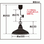 | 説明文 | コード長さ約67.0cm 全長約95.0cm 幅約32.0cm 高さ約22.0cm 重量約570g ・アルミ配照セード(黒塗装/内面白塗装)・スチール(黒塗装)・丸環(黒塗装)・小ロホルダー(黒塗装)?E-26モーガルソケット・黒コード・引掛シーリングキャップ付・黒CPフレンジ・丸木自在(茶)付 |