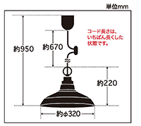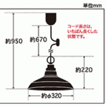 | 説明文 | コード長さ約67.0cm 全長約95.0cm 幅約32.0cm 高さ約22.0cm 重量約570g ・アルミ配照セード(緑塗装/内面白塗装) ・スチール(緑塗装)・丸環(緑塗装) ・小ロホルダー(緑塗装)?E-26モーガルソケット・黒コード・引掛シーリングキャップ付・黒CPフレンジ・丸木自在(茶)付 |