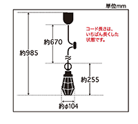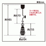 | 説明文 | コード長さ約67.0cm 全長約98.5cm 幅約10.4cm 高さ約25.5cm 重量約390g ・スチール(白塗装)・丸環(白塗装) ・小ロホルダー(白塗装) ・E-26モーガルソケット・白コード・引掛シーリングキャップ付・白CPフレンジ・丸木自在(生地)付・ビス止めガード |