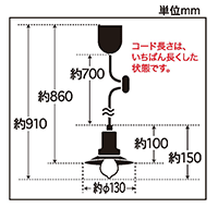 | 説明文 | コード長さ約70.0cm 全長約86.0cm 幅約13.0cm 高さ約10.0cm 重量約290g ・アルミPlSセード(生地)・スチール(黒塗装)・ローカンビス止めホルダー(黒塗装)?E-26モーガルソケット・黒コード・引掛シーリングキャップ付・黒CPフレンジ・丸木自在(茶)付 |