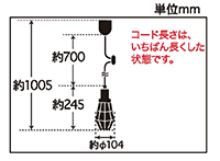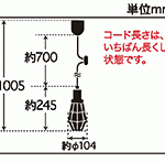 | 説明文 | コード長さ約70.0cm 全長約100.5cm 幅約10.4cm 高さ約24.5cm 重量約380g ・スチール(黒塗装)・ローカンビス止めホルダー(黒塗装) ・E-26モーガルソケット・黒コード・引掛シーリングキャップ付・黒CPフレンジ・丸木自在(茶)付・ビス止めガード |
