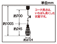 | 説明文 | コード長さ約70.0cm 全長約100.5cm 幅約10.4cm 高さ約24.5cm 重量約380g ・スチール(真鐙ブロンズ鍍金)・ローカンビス止めホルダ一(真鍮ブロンズ鍍金)・E-26モーガルソケット・黒コード・引掛シーリングキャップ付・黒CPフレンジ・丸木自在(茶)付・ビス止めガード |