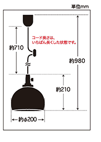 | 説明文 | コード長さ約71.0cm 全長約98.0cm 幅約20.0cm 高さ約21.0cm 重量約600g ・鉄鉢硝子セード・セードホルダー(φ65) ・キーソケット・黒コード・引掛シーリングキャップ付・黒CPフレンジ・丸木自在(茶)付 |