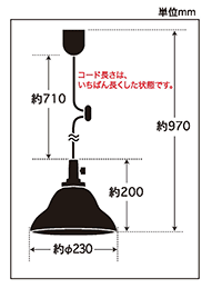 | 説明文 | コード長さ約71.0cm 全長約97.0cm 幅約23.0cm 高 さ約20.0cm 重量約660g ・ベルリヤ硝子セード・セードホルダー( φ65) ・キーソケット・黒コード・引掛シーリングキャップ付・黒CPフレンジ・丸木自在(茶)付 |