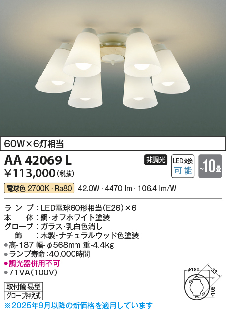 AA42069L コイズミ照明 LEDシャンデリア 〜10畳 60W×6灯相当