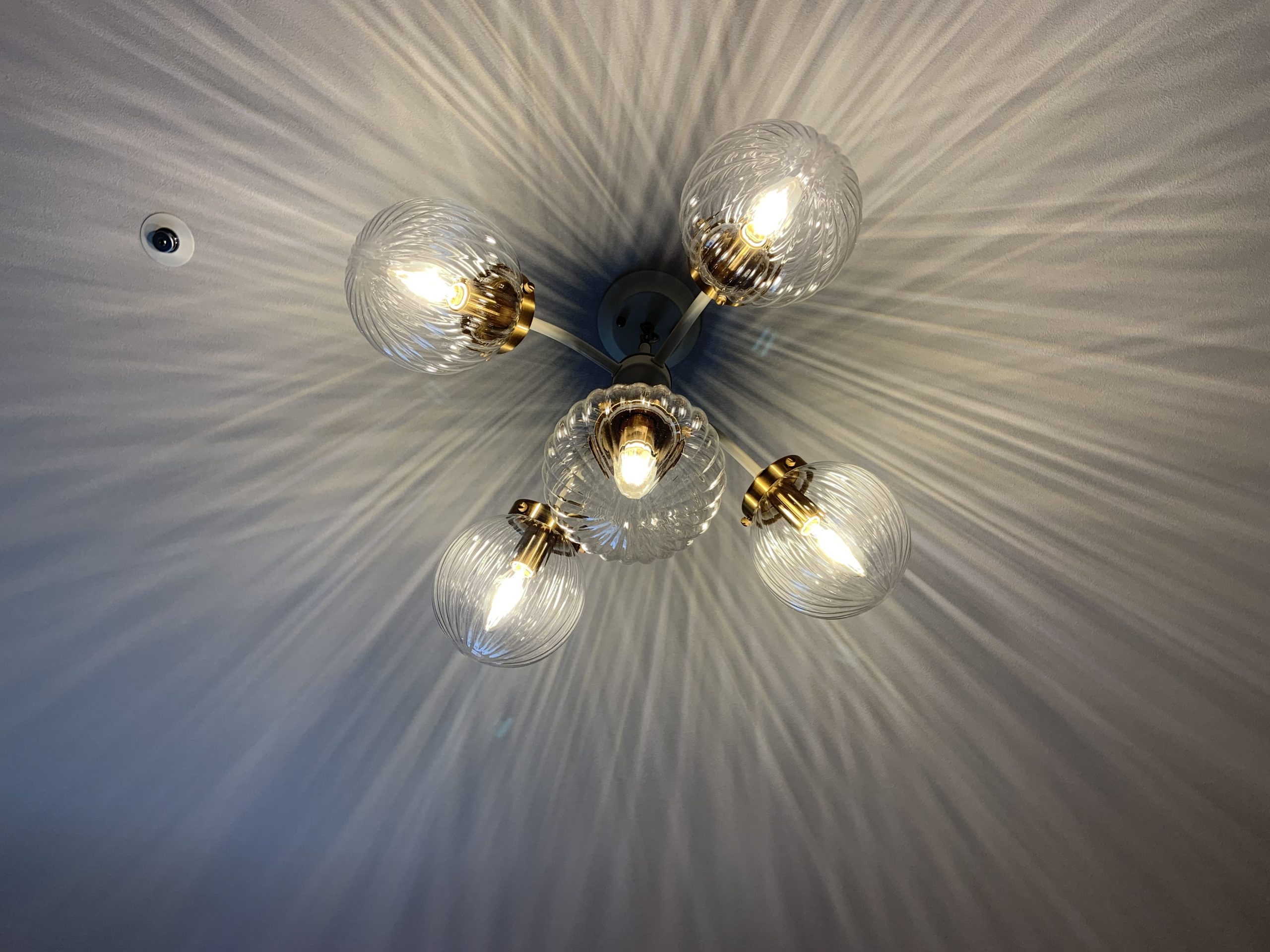 白い本体に気泡をイメージしたような透明感のある丸いガラスが特徴です。丸ガラスは縦にラインが入っており、点灯するとガラスのラインが浮き上がります。器具に重量感はなくシンプルな空間にもおすすめです。直付けタイプは器具高も低いため、様々なシーンにてご使用いただけます。