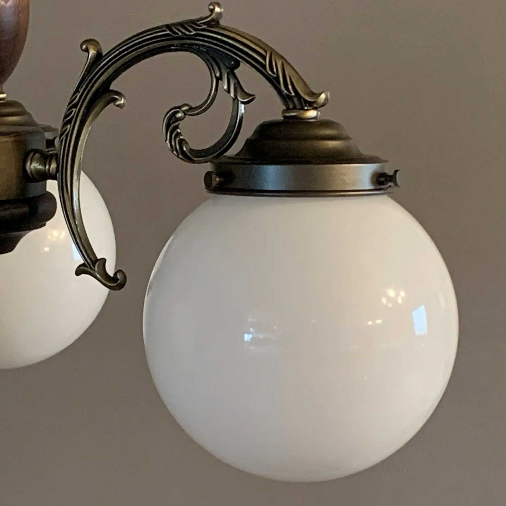 鋳物アームにレトロな雰囲気の丸ガラスを合わせました。パールホワイトの丸ガラスは房をイメージさせ、ボリューム感もあります。レトロな雰囲気と大正浪漫の雰囲気もあるシャンデリアです。本体の木にはブナ材を使用し、国内にて挽き物にて加工して製作しています。