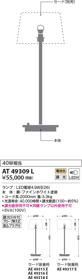 | 説明文 | ランプ:LED電球40形相当(E26) 本体:鋼・ファインホワイト塗装 高-1465 幅-φ300 コード長-2000mm 重-3.3kg 消費電力:4.9W 演色性:Ra83 色温度:2700K 光源寿命:40,000時間 調光範囲(約5〜100%) 調光器併用不可 同梱ランプ以外使用不可 6VA(100V) |