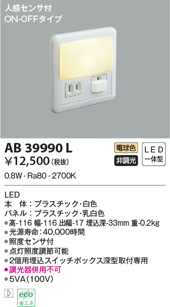 | 説明文 | 本体:プラスチック・白色 パネル:プラスチック・乳白色 高-116 幅-116 出幅-17 埋込深-33mm 重-0.2kg 消費電力:0.8W 演色性:Ra80 色温度:2700K 光源寿命:40,000時間 点灯照度調節可能 2個用埋込スイッチボックス深型取付専用 調光器併用不可 5VA(100V) |
