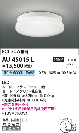 AU45015L コイズミ照明 LED防雨防湿型シーリング FCL30W相当 一般住宅用(営業用浴場使用不可)