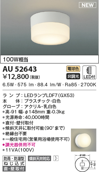 AU52643 コイズミ照明 LED防雨防湿型ブラケット 100W相当 一般住宅用(営業用浴場使用不可)