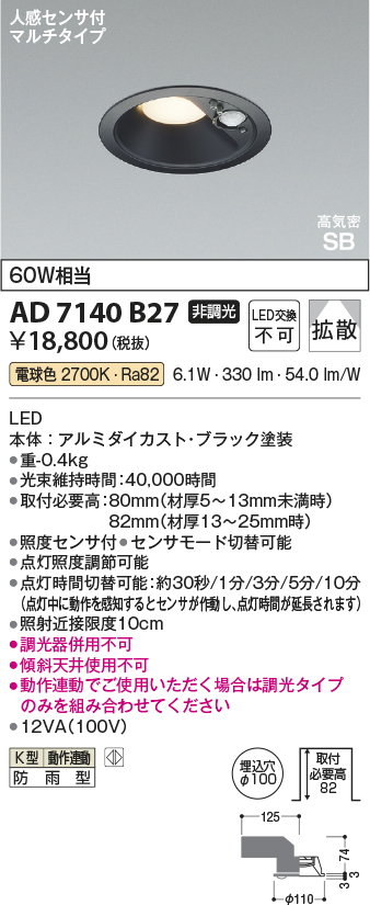 | 説明文 | 本体:アルミダイカスト・ブラック塗装 幅-φ110 出幅-6 埋込穴径-φ100 埋込高-74 取付必要高-82mm 重-0.4kg 消費電力:6.1W 定格光束:330 lm 固有エネルギー消費効率:54.0 lm/W 演色性:Ra82 色温度:2700K 光源寿命:40,000時間 センサモード切替可能 点灯照度調節可能 点灯時間切替可能:約30秒/1分/3分/5分/10分(点灯中に動作を感知するとセンサが作動し、点灯時間が延長されます) 動作連動:K型センサ動作連動器具とLED5.5W調光タイプのダウンを含み5台まで 取付必要高:80mm(材厚5〜13mm未満時)82mm(材厚13〜25mm時) 調光器併用不可 動作連動でご使用いただく場合は調光タイプのみを組み合わせてください 照射近接限度10cm 傾斜天井使用不可 12VA(100V) |