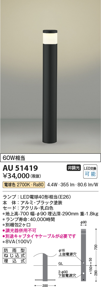 | 説明文 | ランプ:LED電球40形相当(E26) 本体:アルミ・ブラック塗装 セード:アクリル・乳白色 地上高-700 幅-φ90 埋込深-290mm 重-1.8kg 消費電力:4.4W 定格光束:355 lm 固有エネルギー消費効率:80.6 lm/W 演色性:Ra80 色温度:2700K 光源寿命:40,000時間 調光器併用不可 別途キャブタイヤコードが必要です ※別梱包2ヶ口 8VA(100V) |