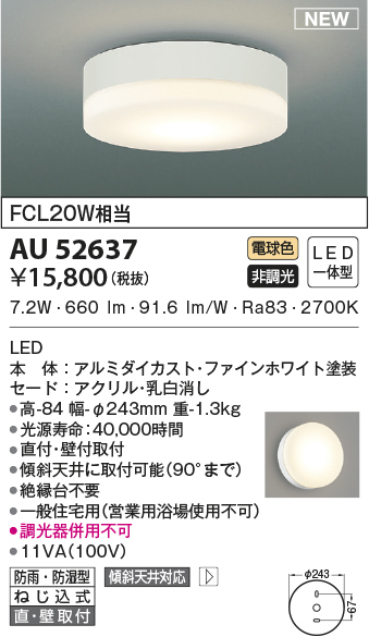 AU52637 コイズミ照明 LED防雨防湿型シーリング FCL20W相当 一般住宅用(営業用浴場使用不可)