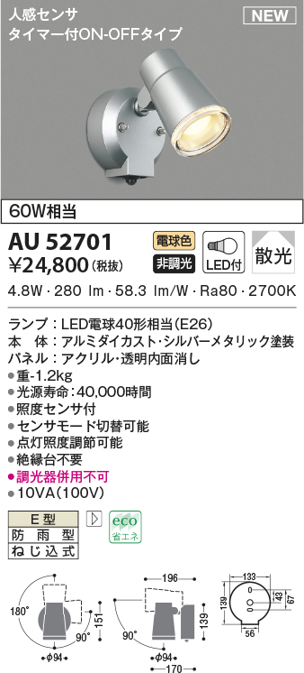 | 説明文 | ランプ:LED電球40形相当(E26) 本体:アルミダイカスト・シルバーメタリック塗装 パネル:アクリル・透明内面消し 高-151 幅-φ94 出幅-170mm 重-1.2kg 消費電力:4.8W 定格光束:280 lm 固有エネルギー消費効率:58.3 lm/W 演色性:Ra80 色温度:2700K 光源寿命:40,000時間 センサモード切替可能 点灯照度調節可能 調光器併用不可 10VA(100V) |