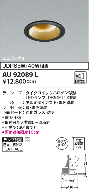 AU92089L コイズミ照明 防雨防湿型ユニバーサルダウンライト JDR65W/40W相当 ランプ別売