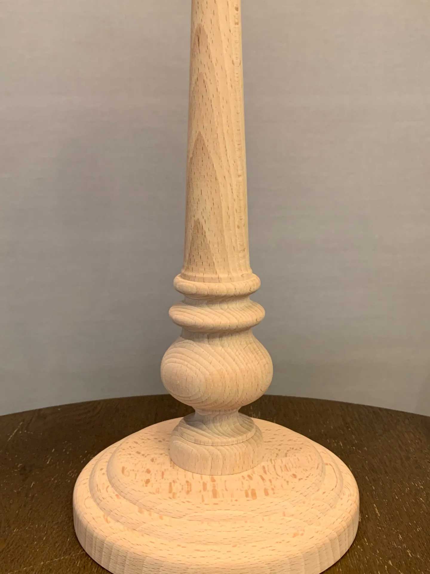 国内にて木材を加工し製作しているオリジナルスタンドライトです。ブナ材を轆轤を使い、職人さんが一つ一つ手作業にて加工しています。真鍮生地の素材を生かすため、木にもあえて塗装などの処理は行わず優しい仕上がりとなっています。木目や真鍮素材の経年劣化は、製品の特徴としてお楽しみください。