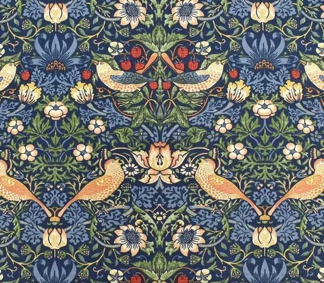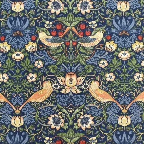 いちごを育てようとしたが、食いしん坊の鳥たちに食べられてしまった。そんな情景を描いた作品は園芸家たちの日常の暮らしの中にある小さな悩みからインスピレーションを得ています。当時のオリジナルはインディゴ抜染技法で作製されたもので、まずインディゴに染めた生地のデザイン部分の色を抜き、さらに同じ工程を今度は赤、緑、黄色でプリントするという非常に高度なプリント技法でした。その結果生み出された色はとても豊かで生き生きとしていましたが、プリント工程全体の完了には数日を要したといわれています。