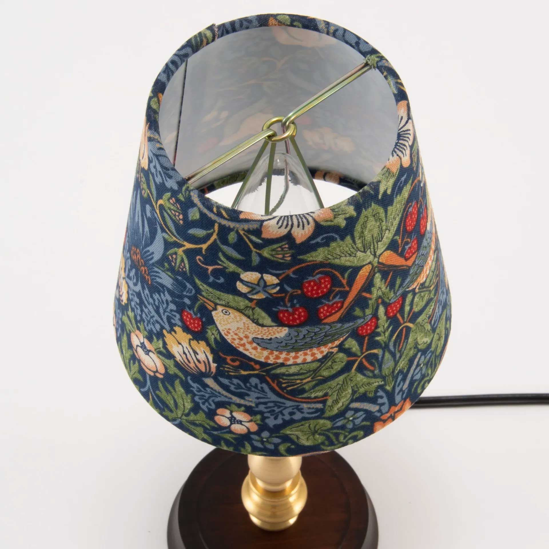歴史あるイギリスの生地、William Morris のテキスタイルを使用し、全て国内で生産された照明器具です。生地の裁断、シェードの張込み、木の加工、塗装、本体の製作まで国内で丁寧に仕上げました。一世紀以上を経た今日でも世界中で根強いファンに愛され続けているモリスのテキスタイル。カーテンやクロスと揃えてご使用いただくのもおすすめです。