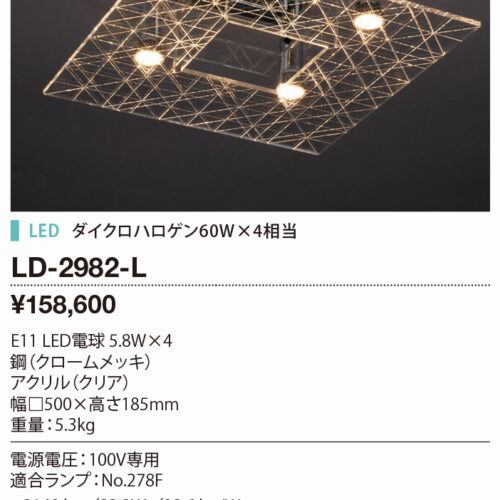 | 説明文 | 取付方法:取付簡易型 光色(LED):電球色 色温度(K):2700K 演色性(Ra):Ra82 LEDタイプ:LED電球 従来光源相当:ダイクロハロゲン60W×4相当 調光:非調光 光源仕様:E11 LED電球 7.0W×4 適合ランプ:三菱 MILIE・LDR7L-M-E11/D/S-27専用 寸法:幅500×500mm・高185mm 重量:5.3kg 材質仕上:鋼(クロームメッキ)/アクリル(クリア) 電圧:100V専用 定格光束(LED):1539lm 消費電力(LED):28W 固有エネルギー消費効率(LED):54.9lm/W LEDモジュール寿命:30000 電源電圧100V専用 非調光 ダイクロハロゲン60W×4相当 LDR7L-M-E11/D/S-27(三菱)専用 2700K Ra82 取付簡易型 ※LED素子にはバラツキがあるため同一形名の器具においても光色、明るさが異なる場合があります。 |